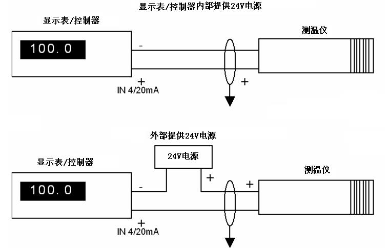 對(duì)于4~20mA的模擬信號(hào)輸出。為兩線制環(huán)路電流輸出方式,其與顯示器或控制器的連接,有以下兩種典型應(yīng)用(連接法):
