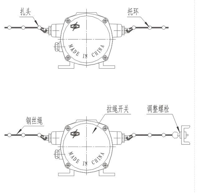 當膠帶運輸現場發生緊急事故時,拉動系在吊耳上的鋼絲繩,是機內的滑塊與開關作用,發出停機信號。 松開鋼絲繩后開關自動復位。